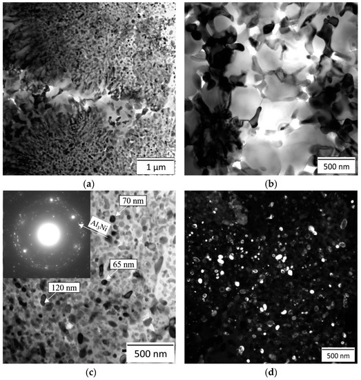 Figure 7 displays the TEM characterization of the structure appearing in the melt-spun ribbons. As can be seen from Figure 7a, it is conceptually similar to the quasi-eutectic structure of the 1 mm cast sample, because it also shows wide bands of the fine intermetallics, surrounded by dendritic bulks of (Al) solid solution, which are clearly seen in Figure 7b. Since the dendritic cells presented are less than 300 nm in size, we can assume that the cooling rate achieved in some areas was much higher than ~106 K/s, probably provided by greater thermal conductivity of the aluminum matrix than intermetallics. The incoherent equiaxed Al3Ni particles with a median linear size of 50 nm are located within the (Al) matrix (Figure 7c). The dark field image (Figure 7d) served as a more contrasting image for inter-particles spacing estimation. Its value is in the 10–50 nm range, which, in turn, shows good promise for a contribution into strength along with precipitate shearing due to possible naturally or artificially triggered decomposition of the (Al) solid solution.