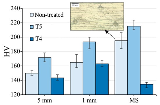 Some samples were selectively subjected to a T5 heat treatment (aging at 200 °C for 1 h without prior quenching) and a T4 heat treatment (470 °C for 1 h). To control the properties evolved, a Vickers’ hardness test at a load of 10 g (0.1 N) and 5 s dwell (for the MS sample), and at a load of 1 kg (10 N) and a dwell time of 10 s (for other samples) was used.
