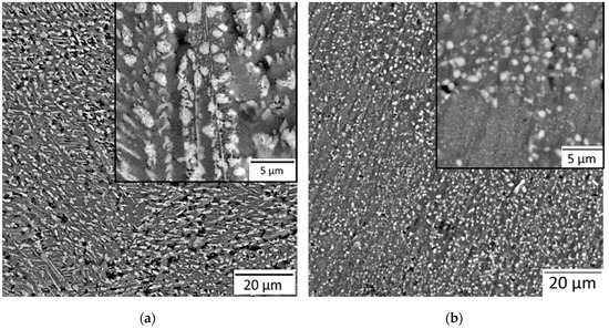 In contrast, under melt spinning conditions, the highest cooling rate was achieved resulting in an ultrafine microstructure with visible dendritic cells of about 1.5 µm (Figure 4e). The estimated cooling rate is 2.3 × 105 K/s, which agrees with literature data [22]. The quasi-eutectic-origin intermetallics of submicron size are located along (Al) solid solution dendritic cells and the ultimate structure looks hypoeutectic. However, some areas are revealed to have very small in-bulks particles, which are to be studied using a high-magnification technique.