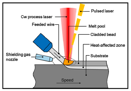 Since Laser Metal Deposition with wire (LMD-w) combines comparatively high deposition rates with a feedstock material which can be handled in a quick and safe way without contaminations, it is a suitable technology for a wide range of applications [2]. In particular, with regard to recent developments for the transformation towards industry 4.0, LMD offers different possibilities. LMD processes are suitable to be automated and can be accompanied by different sensor systems such as in-situ optical scanning of the welding bead surface or temperature monitoring. This allows the generation of data for the setup of a Digital Twin which helps to make production more transparent and reliable [3,4]. A special laser-based process is the dual beam process in which a continuous wave (cw) process laser is combined with an additional pulsed wave (pw) laser beam. The process is schematically represented in Figure 1. The employed pulsed laser powers are typically small in comparison to the cw power (approximately 5–10%). The process has initially been developed for fluxless laser brazing of aluminum [5], but recent results show that a transfer to LMD-w can be advantageous. First, the pulsed laser has an influence on the shape of the cladded bead because the pulsed laser-induced evaporation creates a pressure acting on the melt pool. In addition, the thereby created plasma is assumed to improve the absorption conditions for the cw beam. Therefore, as the needed pw power is low compared to the cw power, but supposed to have a strong influence on absorption, it should be possible to reduce the total power required for the process by optimizing the applied pulsed laser parameters. This hypothesis is examined in this contribution.
