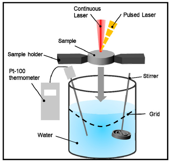 The first setup is a basic research test stand aiming to quantify the change in absorbed energy at different pulsed laser parameters. A schematic of this test stand is shown in Figure 2. The principle of the setup is similar to a calorimeter. A round sample with a diameter of 30 mm and a thickness of 5 mm is clamped in a holder which is situated above an isolating vessel filled with 600 mL of water at 21 °C. The sample is then processed for 41 s at 400 W continuous laser power and different sets of pulsed laser powers and frequencies.