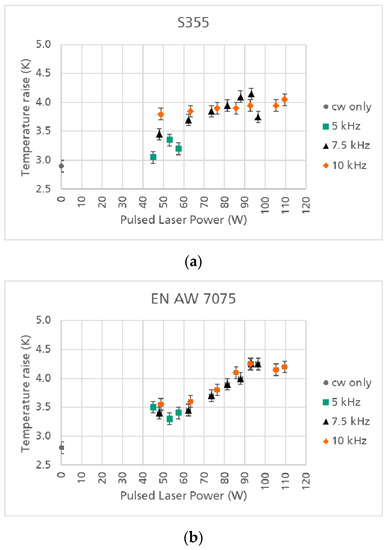 As the continuous laser power is kept constant, the global raise in temperature with applied pw power is easily explainable by the increase in total added energy which leads to a stronger warming of the water. The more unexpected observation is related to the gradient of the temperature raise. For the S355, but especially for the EN AW 7075 samples, the slope of the measured temperature difference decreases at pulsed laser powers above 50 W at 5000 Hz pulse frequency and above approximately 90 W at 7500 and 10,000 Hz. It is possible to explain this phenomenon by the density of the plasma and its related oscillation frequency. At higher pw powers at a given pulse frequency, more material is ablated, which leads to a higher plasma density. Therefore, a higher amount of the still incoming energy is absorbed by the electrons, ions and atoms forming the plasma, which results into a comparatively smaller increase of the temperature. The fact that this effect occurs at lower pw powers for the 5 kHz pulse frequency can be explained by the higher power of the single pulses in this case [15], resulting in stronger evaporation.
