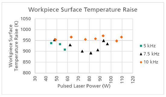 The results achieved by the pyrometer-based measurements of the welding track surface temperature during wire-based LMD of QuFe13 wire on S355 substrates with the dual beam process qualitatively confirm the before-obtained observations. They are visualized in Figure 6. There is a minimum in the temperature increase at intermediate pulsed laser powers, corresponding to the higher absorption in the plasma in this region, as well as a flattening of the curves at higher powers. However, there exists a bigger difference between the temperatures measured at different frequencies, which is not in agreement with the results of the first experimental setup and not fully explainable. One aspect to be considered is the presence of the wire (respectively, the welding bead), which changes the interaction between the plasma and the substrate.