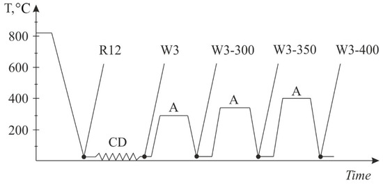 Processing root for experimental wire alloy (see Table 1). CD—cold drawing, A—annealing, R12—as-cast electromagnetic casting (EMC) rod, and W3—wire.