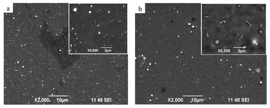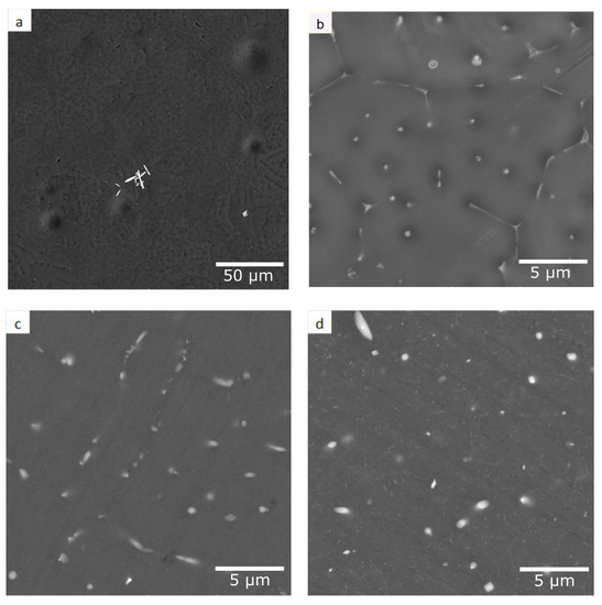 We supposed the manufacturability of the as-cast EMC rod during drawing was very good. This was favored as its fine microstructure did not contain coarse intermetallic particles or inhomogeneities. Cold drawing led to the formation of elongated grains and deformation hardening. Drawing also crushed initial eutectic Al8Fe2Si phase veins into submicron globular particles (Figure 4a,b). It was seen that high-temperature annealing (W400 mod) leads to coarsening of the particles (Figure 4b). Since the as-drawn state (W3 in Table 1) did not imply heating, (Al) retained all the zirconium, which dissolved in it during crystallization. Therefore, the ER for all the initial states (R12, S2 and W3) proved to be close (about 40 nΩm). Figure 5 shows that the ER of the wire and the strip are very close after annealing.