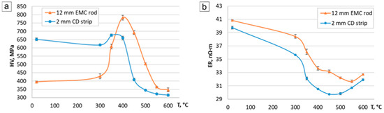 Hardness (HV) (a) and electrical resistivity (ER) (b) vs. temperature of annealing curves for EMC rod and cold rolled strip.