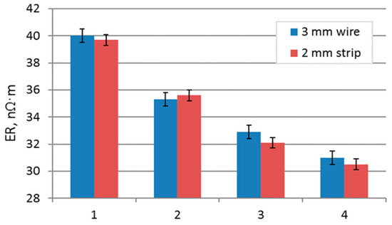 Comparison of electrical resistivity (ER) of 3mm wire and 2 mm strip for Al–0.6%Zr–0.4%Fe–0.4%Si alloy: 1—as-cast, 2—300 °C, 3—300 + 350 °C, 4—300 + 350 + 400 °C.