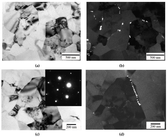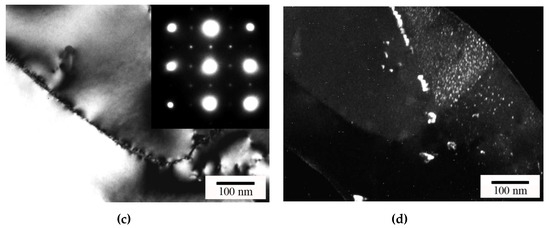 TEM image in the cross section of the Al alloy after cold drawing and annealing at 300 + 350 + 400 °C (W400 see in Table 1): (a,c) bright field (BF); (b,d) dark field (DF); (c) BF TEM image and corresponding SAED patterns (the crystal is close to the [001] zone axis orientation) and (d) DF TEM image showing Al3Zr phase nanoparticles present in the Al matrix.