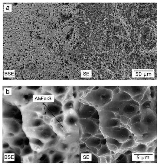 Fracture surfaces of experimental wire alloy (W400 see in Table 1), SEM, left—back scattered electron image, right—secondary electron image, (a) small magnification, (b) high magnification.
