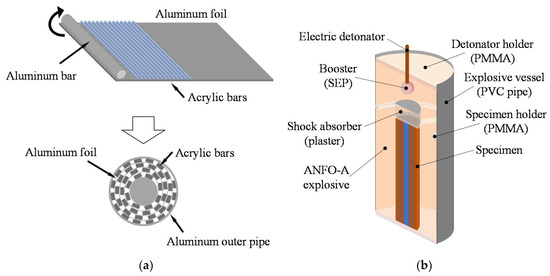 The schematic illustration of the fabrication method and the explosive compaction (cylindrical) assembly is presented in Figure 1, while the physical properties of the components and the assembled specimens are listed in Table 1. The porosity of the specimens could be altered by changing the thickness of the outer pipe and by reducing the diameter of the inner aluminium bar.