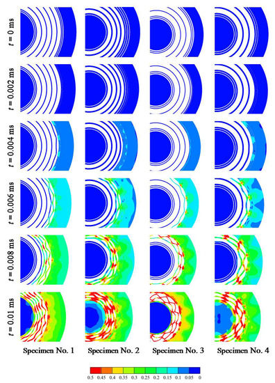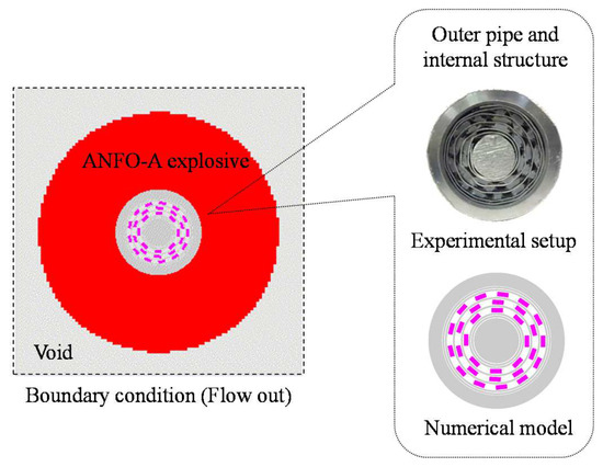 In the computational simulations, the ANFO-A was described as highly pressurised gas with an initial pressure of 0.939 GPa, a detonation velocity of 2.3 km/s, and a density of 530 kg/m3 [32].