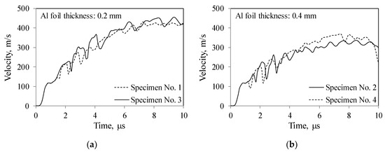Velocity variation of the outer aluminium pipe during explosive compaction: (a) foil thickness 0.2 mm and (b) foil thickness 0.4 mm.