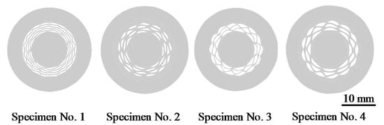 The ammonium-nitrate based ANFO-A with the detonation velocity of 2.3 km/s and the bulk density of 530 kg/m3 was used as the primary explosive for manufacturing the rolled aluminium UniPore structure. The primary explosive was electrically detonated using a booster (10 g SEP explosive). Ignition of the primary explosive caused propagation of the detonation wave through the primary explosive. The detonation gas uniformly radially accelerated the outer aluminium pipe towards the centre of the specimen. The achieved velocity was high enough to allow for welding between surfaces of the outer pipe and aluminium foil. Stable welding conditions and inclination angle were similar to the already known explosive welding mechanism [28]. Furthermore, the explosive welding of clads is being characterised as cold pressure welding. The annealing effect, which would decrease the hardness, does not usually appear, and the increase in hardness is considered to be the result of the work hardening [22]. Figure 2 presents the cross-sections of the recovered specimens, while their geometrical properties (dimensions and porosity) are given in Table 2.