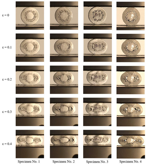 The compressive deformation behaviour of the four specimen types subjected to quasi-static loading conditions is illustrated in Figure 9. A similar deformation behaviour can be noted for all cases. Initially, the porous part of the specimen is compressed, followed by the deformation of the specimen’s core. A strong interface bonding can be observed for the specimen No. 1 (aluminium foil thickness: 0.2 mm and acryl bar thickness: 0.5 mm). The bonds between the foil surfaces of the other three specimen types failed at larger strains, especially in case of the specimen No. 4 (aluminium foil thickness: 0.4 mm and acryl bar thickness: 1 mm).