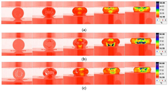 IR thermography images of the dynamic loading sequence (strain increment: ~0.15): (a) Specimen No. 1; (b) Specimen No. 2; (c) Specimen No. 4.