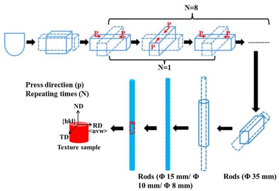 Schematic of the fabrication process of hot-forged rods and the orientations of the samples cut from the rods for texture measurements.