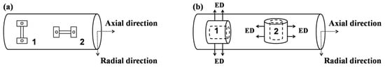 Generally, pipe joints are machined from NiTiNb rods and then expanded at low temperature to augment their inner diameter [,]. According to previous studies, in order to store and ship NiTiNb pipe joints at room temperature and simultaneously optimize the SME, researchers mainly pay attention to the key problem of finding appropriate expansion temperatures and critical expansion strains [,,,,]. However, the expansion direction is rarely considered, despite the anisotropy of SME induced by texture in NiTiNb rods. Identifying the expansion direction that optimizes the SME is therefore crucial for fabricating high-performance NiTiNb pipe joints. The expansion direction can be controlled by preparing the pipe joints along the radial or axial direction of the rods.