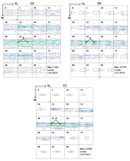 Therefore, in samples of A, B, C with the same ED, the texture types are the same, while the texture intensity is different. In the order of A, B and C, the intensity of {111}<110> texture increases gradually, so the recoverability increases too, which is consistent with the results obtained in Figure 7.