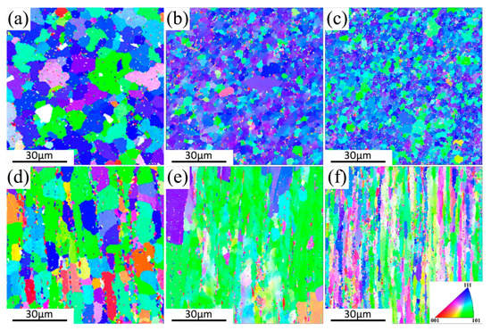 The ODF results of Samples A, B and C are shown in Figure 4. The preferred orientation of all samples concentrates on {111}<110>, as shown in the φ2 = 45° sections of Figure 4a–c. According to Yan’s analysis, on rotary hot forging, the radial direction of rod is subjected to compressive stress, slip planes rotate toward the direction perpendicular to the external stress axis and slip directions toward the plastic flow direction or to the rod axis []. Thereby, the {111}<110> texture formed in the hot-forged rods are mainly related to the activation of {111}<110> slip systems in the B2 phase. Meanwhile, the maximum orientation density of {111}<110>, from low to high, is ordered as A, B and C, indicating that the texture intensity can be controlled by the deformation degree. The inverse pole figure (IPF) maps of above three samples are obtained by EBSD test to present grain orientation (Figure 5). A strong {111}<110> texture is also observed in all samples, with grains in blue (<111> // axial direction) crossing most of the cross section and grains in green (<110> // radial direction) crossing most of the longitudinal section of the rods. This is consistent with the result tested by XRD above. In addition, grains of different shape with equiaxed grains on cross section (Figure 5a–c) and elongated grains on longitudinal section (Figure 5d–f) are observed, which means that the grains are elongated along the axial direction. Meanwhile, with the increase of deformation degree, the average grain size decreases and the grain morphology is further elongated.