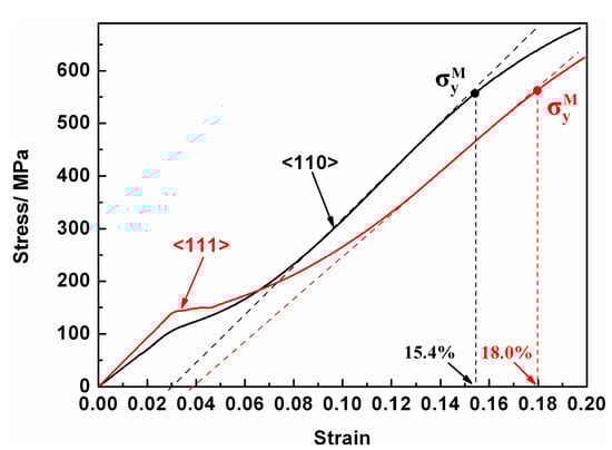 Tensile curves obtained during loading at −60 °C along the <111> and <110> direction. The martensite yield nominal point is got from the intersection of true stress–strain curve with the martensite elastic stage tangent after 0.2% horizontal movement.