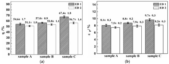 Recoverability of Samples A, B and C along the expansion directions of ED1 and ED2: (a) recovery rate η and (b) recovery strain εr.