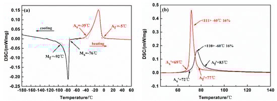 Differential scanning calorimetry (DSC) curves (a) before and (b) after tension to 16% at −60 °C along the <111> and <110> direction.
