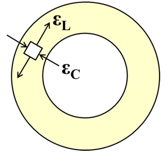 Different from uniaxial tensile sample, as for pipe joints, it should be analyzed in cylindrical coordinate rather than rectangular coordinate. With the inner diameter D0 expands to D1 in the cross section, the mechanical strain ε can be divided into a radial compressive strain εC and a circumferential tensile strain εL, as shown in Figure 9. During the heating process, the recovery of εC and εL make the inner diameter D1 decreasing to D2, thus realizing the connection of the two pipes. According to previous studies, the SME of pipe joints is mainly determined by circumferential strain εL rather than radial strain εC []. Hence, the recovery strain of pipe joints can be calculated as