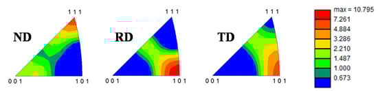 Inverse pole figures (IPFs) of Sample C, representing the preferred crystalline orientations in the axial direction (ND), radial direction (RD) and circumferential direction (TD) of the rod.