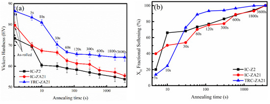 Second-phase particles of three experimental alloy sheets in Figure 3 can play the role of heterogeneous nucleation and result in recrystallization characterizations of two stages. At the same time, the difference in second-phase particles of experimental alloy sheets leads to different softening behaviors. The SRX process of the TRC-ZA21 alloy was blocked by the dispersed particle with a fine size. The coarse second-phase particles of IC-Z2 and IC-ZA21 alloys increased the nucleation of recrystallization grains, which led to more significant fractional softening in hardness at the initial stage of annealing treatment. In addition, aggregated distribution of second phase particles in IC-ZA21 alloys further boosted recrystallization behavior, which was contributed to the formation of high fractional softening in hardness with an annealing time of 5 s-39.9%. Under the effect of second-phase particles with fine size in the IC-ZA21 alloy, the growth rate of IC-ZA21 was lower than that of the IC-Z2 alloy. Hence, the fractional softening of the IC-Z2-10s alloy was higher than that of the IC-ZA21-10s alloy. This indicated that the characterization of second-phase particles, including size, distribution and density, had a significant effect on the SRX process.
