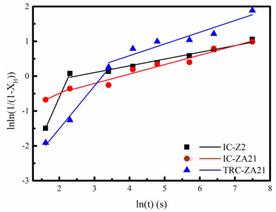 The recrystallization fraction (1/(1 − XV)) can be replaced by the form of fractional softening in hardness (1/(1 − XH)). The relationship between lnln(1/(1 − XH)) and lnt is plotted in Figure 2. The results revealed that fractional softening progress of experimental alloy sheets exhibited the characterization of two stages, with the help of two different Avrami exponents. The specific Avrami exponents are shown in Table 2; the value of n2 was obviously lower than n1, which illustrated the characterization of two stages presented during recrystallization process. High fractional softening in IC-ZA21 alloy was an exhibition at the initial stage of annealing process (the XH is 39.9% when annealing time was 5 s), and then the recrystallization behavior at the following stage was influenced. The difference between the n1 value and n2 value in the IC-ZA21 alloy was more inconspicuous than in other alloys. However, the process of softening in hardness in the IC-ZA21 alloy sheets exhibited essentially two stages. A similar softening behavior of two stages also existed in other metals, such as cold-rolled Ti, Cu and low-carbon steel, and the recrystallization phenomena were related to the heterogeneous nucleation of recrystallization grains [32]. In addition, the varied softening behavior is also attributed to the static recovery mechanism, which is the first process during annealing treatment. The dislocation density may significantly decrease, while the new nucleated recrystallized grains do not occur. The decreased density of dislocations can result in a reduced distortion degree of the magnesium matrix, and it is beneficial to softening the hardness of materials. When the static recovery process dominates the initial stage of annealing treatment, the two stages of softening behavior can show the transformation from static recovery to static recrystallization.