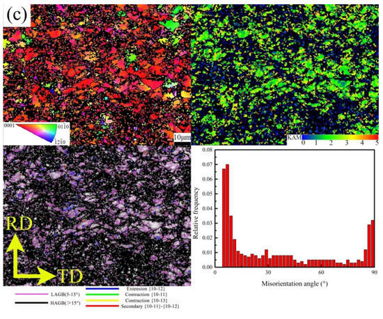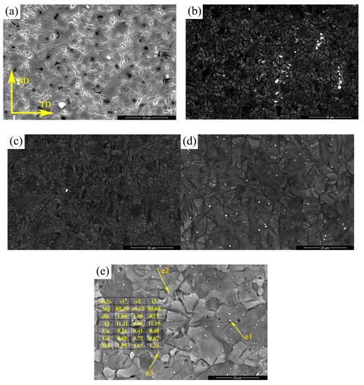 The close relationship is existence between Avrami exponent and grain nucleation mechanism, higher n-value indicated that a significant characterization of heterogeneous nucleation was possessed in materials. The obvious variation in the n-value of experimental alloys demonstrated that the nucleation of recrystallization grains was dominated by a heterogeneous nucleation mechanism. Grain boundary, shear band, deformation twinning and second-phase particles can act as preferential nucleation sites for recrystallization grains in deformed magnesium alloys [34,35,36]. Hot-rolled microstructures of experimental alloy sheets are shown in Figure 3; the rolling direction (RD) and transverse direction (TD) in the samples of Figure 3 are presented in Figure 3a. Different characterizations of second-phase particles are exhibited. A large amount of second phase particles with fine size and uniform distribution existed in the TRC-ZA21 alloy, which can be seen from the higher magnification in Figure 3d, and the amount of second-phase particles with coarse size was extremely limited. The EDS results of second-phase particles indicated that the main alloying elements in these particles contained Al, Mn. A certain content of Ca and Gd concentration was found in the second-phase particles due to the high affinity between Ca, Gd atoms and Al-Mn series compound in magnesium alloys [37,38]. The second-phase particles with a coarse size can be observed in IC-Z2 and IC-ZA21 alloys; further, the distribution of coarse particles in IC-ZA21 exhibited aggregation phenomenon. Moreover, second-phase particles with a fine size were also found in the IC-ZA21 alloy.