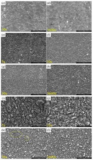 Microstructure during salt bath annealing treatment. IC-Z2 alloy (a) 5 s; (b) 10 s; (c) 30 s; (d) 3600 s; IC-ZA21 alloy (e) 5 s; (f) 10 s; (g) 30 s; (h) 3600 s; TRC-ZA21 alloy (i) 5 s; (j) 10 s; (k) 30 s; (l) 3600 s.
