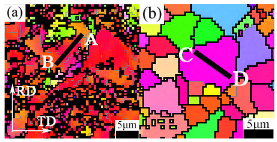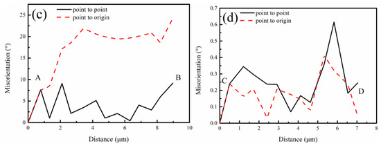 As IPF figures in Figure 5 shown, changes in grain orientation were found in the interior of some grains. For monitoring the variation in crystal distortion during the annealing process, the local enlarged IPF figures of TRC-ZA21 alloy at different annealing times were derived from corresponding EBSD-IPF maps and shown in Figure 6a,b; the rolling direction (RD) and transverse direction (TD) in the samples of Figure 6a,b are presented in Figure 6a. An annealing time of 10 s corresponded to the initial stage of annealing treatment (Figure 6a), and an annealing time of 3600 s was the later period. At the initial stage of annealing treatment, significant variations in colors in small grains were easily found, and orientation gradient was formed. As Figure 6c shows, the misorientation angle between point A and point B was 24.3°. Large orientation gradient formed in microstructure at the initial stage was attributed to lattice rotation by rolling pressure [49]. In addition, the accumulations of deformation and dislocation in the interior of the same grains were inhomogeneous. LAGBs were formed by the rearrangement and merging of cumulative dislocations [50]. Therefore, high KAM values were formed under the effect of high misorientation in grains. The orientation gradient was eliminated with the formation of recrystallized grains. The misorientation between point C and point D in Figure 6d was less than 1°.