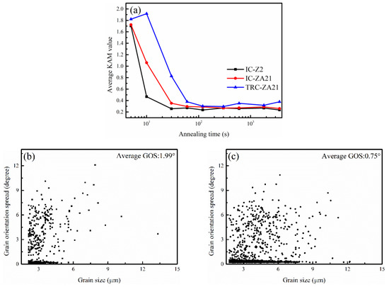 Under the effect of annealing process, internal stress was released by recovery and recrystallization mechanism, and the distortion degree of microstructure decreased. The relationship between KAM values in experimental alloy sheets and annealing time was plotted in Figure 7a. The average KAM values in experimental alloys decreased from 1.7 at the initial stage to 0.25~0.35 with the annealing treatment. Moreover, the average KAM value in TRC-ZA21 alloy was higher than that in IC-Z2 and IC-ZA21 alloys at the initial stage of annealing process. KAM value indicated local misorientation degree determined by density of geometrically necessary dislocation (GND) [51]. Higher KAM value illustrated that higher density of GND existed in microstructure, and pointed out higher residual stress. It also revealed that the SRX behavior in TRC-ZA21 alloy was limited at the initial stage of the annealing process.