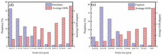Grain orientation spread (GOS) was obtained by the calculated average misorientation of pixel points in grains to analyze plastic strain in the EBSD system [52]. The GOS was higher in deformed grains due to the occurrence of distortion, and recrystallization grains without distortion exhibited a lower GOS [53]. As Figure 4k shows, obvious grains with coarse size were found in TRC-ZA21 microstructure under an annealing time of 30 s, and the relationship between grain size and GOS is depicted in Figure 7b. For comparison, the grain size and GOS values of individual grains in TRC-ZA21 alloy after 3600 s annealing treatment are shown in Figure 7c. Intuitively, the average GOS value in the TRC-ZA21-30s alloy was higher than that in the TRC-ZA21-3600s alloy; the specific GOS values were 1.99° and 0.75°, respectively. The related GOS values of different grain sizes are exhibited in Figure 7d,e. With decreasing grain size, GOS a presented reduced trend, especially for the grains whose GOS value of lower than 0.5° belonged to a fine grain size. The variations in GOS values with annealing times of 30 and 3600 s in the TRC-ZA21 alloy demonstrated that salt bath annealing treatment had the potential to release deformation stored energy. The energy releasing efficiency in the TRC-ZA21 alloy was lower than that in the IC-Z2 and IC-ZA21 alloys due to the restricted SRX behavior, and it also led to higher KAM values in the TRC-ZA21 alloy at the initial stage of annealing treatment.