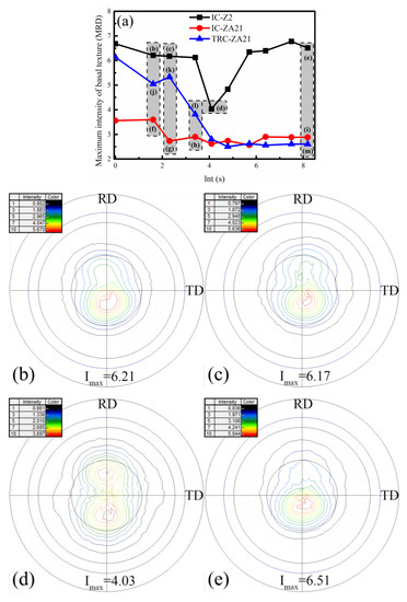 Evolution of basal texture during annealing treatment: (a) variations of maximum intensity during annealing treatment (0001) pole figures of IC-Z2 alloy, (b) 5 s; (c) 10 s; (d) 60 s; (e) 3600 s (0001) pole figures of IC-ZA21 alloy (f) 5 s; (g) 10 s; (h) 30 s; (i) 3600 s (0001) pole figures of TRC-ZA21 alloy (j) 5 s; (k) 10 s; (l) 30 s; (m) 3600 s.