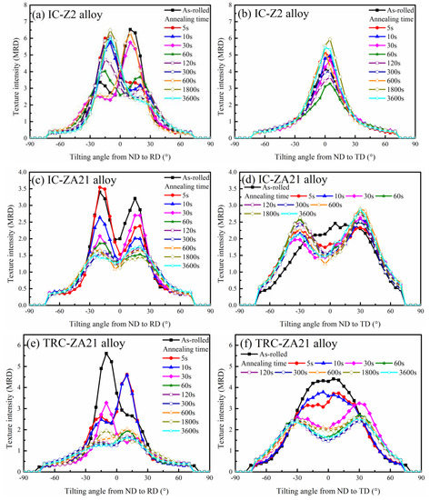 Compared with the IC-Z2 alloy, the evolution of basal texture in ZA21 alloy sheets exhibited a difference during salt bath annealing treatment. Moreover, the diversity of basal texture characterization existed between the IC-ZA21 and TRC-ZA21 alloy sheets. The (0001) pole figures of IC-ZA21 alloy sheets with annealing time for 5, 10, 30 and 3600 s are shown in Figure 8f–i; related maximum intensities were 3.60, 2.73, 2.90 and 2.88 MRD. The basal texture of the IC-ZA21 alloy exhibited RD tilting and stronger spreading along TD in hot-rolling condition and the initial stage of the annealing process. As Figure 8f shows, the diffusion content in the basal pole along TD was significantly higher than that along RD in the IC-ZA21 alloy with annealing of 5 s. The intensity variations in (0001) pole figures in the IC-ZA21 alloy from ND to RD and TD were plotted in Figure 9c,d. The intensity profiles from ND to RD in IC-ZA21 alloy exhibited double peaks at the initial stage of annealing. However, the peak intensity decreased with the increase of annealing time. Meanwhile, TD tilting characterization gradually emerged with titling angle of 25–30°, as seen in Figure 9d. The variations in the intensity profiles in IC-ZA21 indicated that a noticeable transformation of grain orientation occurred during the annealing process. The characterization of basal texture in the IC-ZA21 alloy changed from RD tilting to TD tilting.