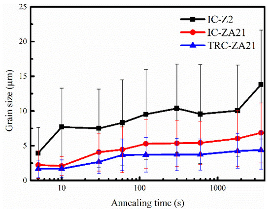 The average grain sizes of experimental alloys calculated by EBSD information were shown in Figure 10. The results indicated that the grain growth behavior of experimental alloys exhibited differences. The average grain size increased with increases in annealing time, and the sequence of grain size was IC-Z2 > IC-ZA21 > TRC-ZA21. For example, the average grain sizes with an annealing time of 3600 s in IC-Z2, IC-ZA21 and TRC-ZA21 alloy sheets were 13.8, 6.9 and 4.4 μm, respectively. The difference in grain growth behavior was related to microstructure characterization, especially second-phase particles. According to the size, spacing and volume fraction of second phase particles in magnesium alloys, the effects of second-phase particles on the recrystallization process divided into a promoting role and inhibition influence. Nano-sized second-phase particles existed in IC-ZA21 and TRC-ZA21 alloy sheets, which was beneficial to pinning the movement of the grain boundary and restricting grain growth. Moreover, the recrystallization behavior in the IC-ZA21 alloy was promoted under the effect of the PSN mechanism, due to the second-phase particles with coarse size. The lowest grain growth rate was obtained in the TRC-ZA21 alloy, which was attributed to the finer size of second-phase particles. The effect on preventing grain growth in IC-Z2 alloy was weak due to the second-phase particles with a coarse size. Hence, the grain growth rate of IC-Z2 alloy was higher than that of the IC-ZA21 alloy.