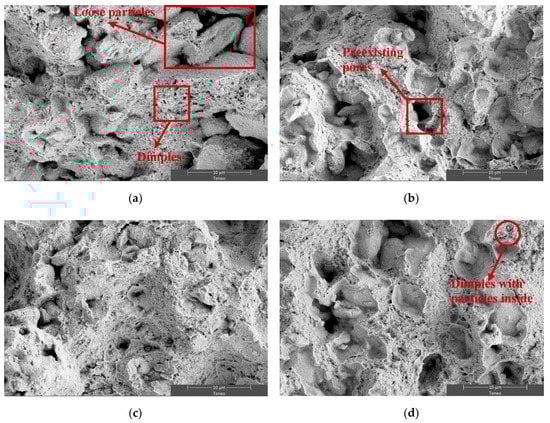 On the other hand, scanning electron micrographs, Figure 6 and Figure 7, illustrate the fracture surfaces microscopically. All the specimens exhibit a surface consisting of a plentiful presence of dimples. The size of these dimples gets larger as the duration of the ammonia atmosphere is prolonged (F5, F10, and C). Dimples are formed as a result of the presence of hard particles in the ductile aluminium matrix. Accordingly, the probability of dimple formation also increases, making the already formed dimples easier to grow and coalesce [26]. In addition, a tensile test at 250 °C induces the softening of the aluminum matrix, which also contributes to increasing the size of the dimples. In this way, Figure 7d show a fracture surface where some small dimples with particles inside can be seen, and some larger dimples are also visible due to the growth and coalescence of voids during the tensile test at 250 °C. This morphology involves a certain level of plastic deformation at the microscopic level. However, the low ductility, as well as by the proportion of shallow dimples, is evidenced by the fact that an elongation lower than 1% is achieved for all samples.