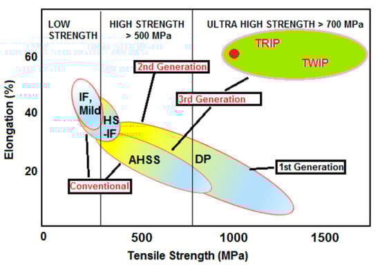 There are several types in advanced high strength steels (AHSSs), such as dual-phase (DP), transformation-induced plasticity (TRIP), twinning-induced plasticity (TWIP), complex phase (CP), martensitic (MART or MS), interstitials free (IF) steels, and so on [1]. AHSSs show good mechanical properties, are lightweight and a reasonable cost. AHSSs have unique microstructures, such as a combination of retained austenite, bainite, and/or ferrite multiphases, that are transformed or twinned during elongation. A brief classification of AHSSs steels can be summarized in Figure 1.