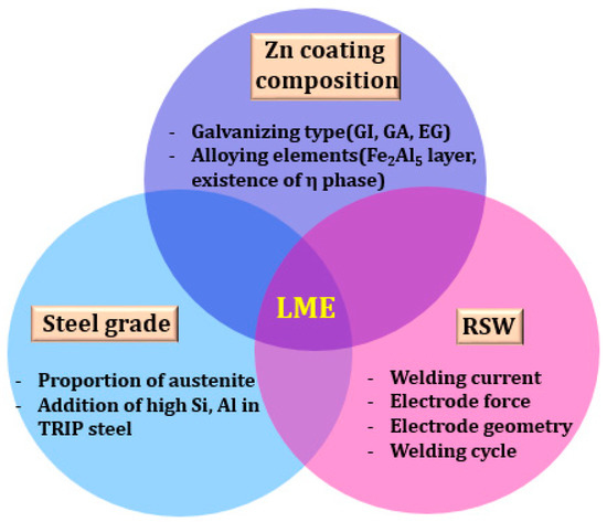 One of the major problems in commercializing galvanized TRIP steel as an autobody are LME phenomena. During RSW, molten Zn easily infiltrates the grain boundaries of the steel surface. Cracks are created and induce brittle fracture, especially when compared to bare welded steel. This degrades the welding quality. It is widely known that LME develops due to several factors: liquid Zn, LME-susceptible metal alloys, and welding conditions. Figure 2 depicts the combined factors that make galvanized steels sensitive to LME.
