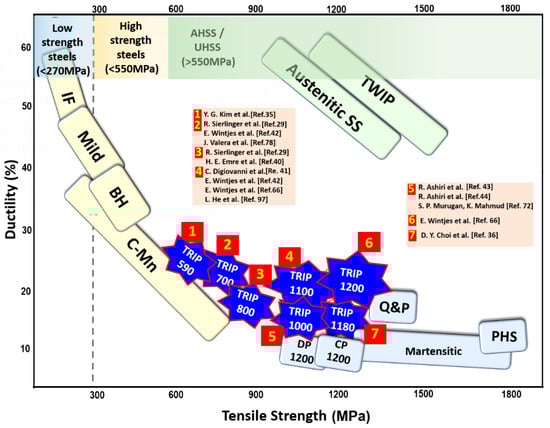 Figure 3 presents the diverse steel types and LME studies related to TRIP steels. It can be noticed that TRIP steel is classified as an AHSS.