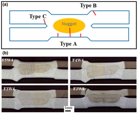 (a) Schematic diagram for classification of LME cracks at various locations, and (b) cross-sectional microstructures of spot welds at various electrode force and time. Reprinted with permission of [36], Springer, 2018.