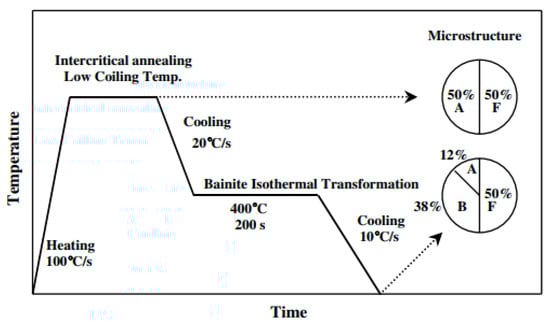 Figure 6 shows one example of a fabrication process of TRIP steel. The galvanization process of TRIP steel is given by Maki et al. [49]. The multiphase microstructure is usually fabricated by the heat treatment process following two steps: first, inter-critical annealing between Ac1 to Ac3 (780–880 °C) for 1 min, followed by quenching; second, the isothermal transformation between 350–500 °C for 2–3 min [50]. After the first treatment, a microstructure which contains a similar proportion of austenite and ferrite is created. During the second isothermal treatment, most of the austenite is transformed into bainite. Finally, TRIP steel contains 50–60 wt% ferrite, 25–40 wt% bainite, and 5–15 wt% of retained austenite. More than half of the retained austenite is transformed into martensite during the elongation of TRIP steel [51].