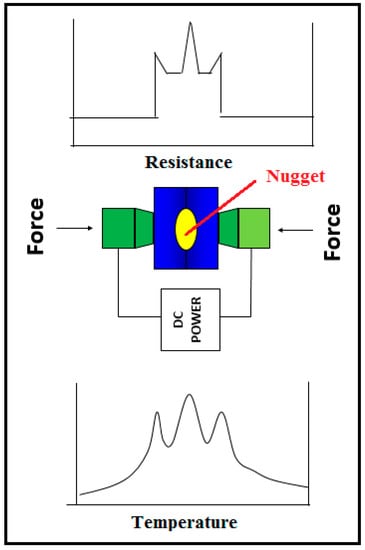 Figure 7 shows a schematic of resistance and temperature distributions of two steel sheets during RSW. The attached part of the two sheets shows the highest resistance. Therefore, the weld pool (or nugget) shows the highest temperature [36,68]. The contact part between the surface of the steel sheet and electrode also shows pretty high resistance and temperature.