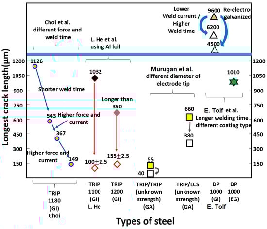There are some research activities on TWIP steel LME sensitivity with respect to coating type [74,76,96]. Ashiri et al. have explained that hot-dip GI steels show higher sensitivity compared to hot-dip GA or EG ones [74,76]. The weldable current range was set for the emergence of cracks smaller than 10 μm. The difference in welding current with or without the occurrence of LME was investigated. The reduction of the weldable current range was highest for GI steel. This can be explained as GI coating is the most susceptible to LME. However, there are only a few investigations that compare LME sensitivity among GI-, GA-, and EG-coated TRIP steel, as shown in Figure 9 [36,70,72,97]. A more detailed discussion of the effect of coating type is required.