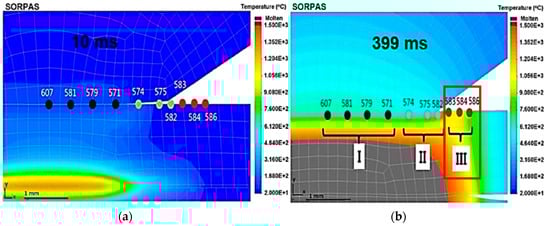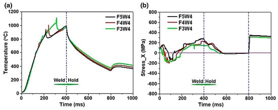 In some studies, it was found that the lower electrode force caused severe LME [35,36]. For instance, Figure 10 presents the temperature and stress profile of the indented area. This area is seen in region III, node 583. It was revealed that the longest LME crack was found at F3W4 (3 kN electrode force and 400 ms weld time), compared to F4W4 or F5W4. It can be seen that peak temperature was highest (green line, 1120 °C) at the F3W4 condition in Figure 10a.