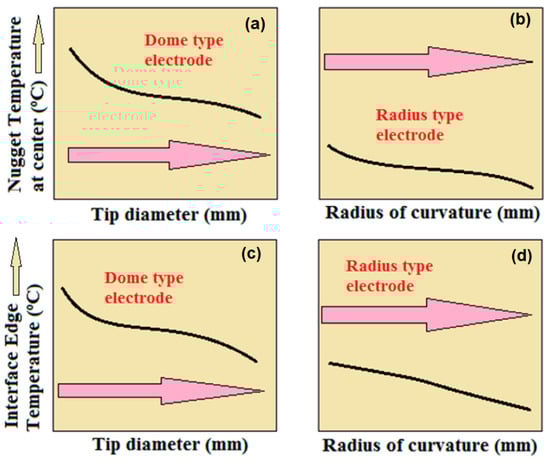 Temperature at the electrode–surface interface: (a) temperature at the center part (nugget) with a diameter of dome electrode; (b) temperature at the center with radius-type electrode; (c) temperature at the edge with a diameter of dome electrode; and (d) temperature at the edge with radius-type electrode.