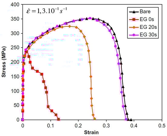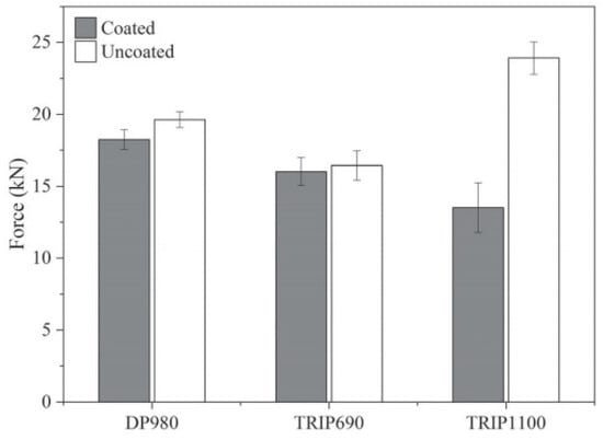 Due to the lowest force, the lowest tensile stress was obtained at F3W4. The reason for severe LME cracks was attributed to the lower electrode force, which delayed the contact time to the workpiece and decreased the cooling effect of the electrode. Therefore, the exposure time of liquid Zn increased the penetration of the steel surface as shown in Figure 11a,b.