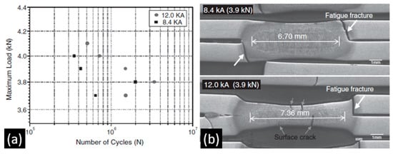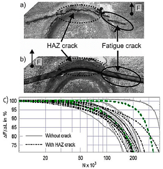- Gaul, H.; Weber, G.; Rethmeier, M. Influence of HAZ cracks on fatigue resistance of resistance spot welded joints made of advanced high strength steels. Sci. Technol. Weld. Join. 2011, 16, 440–445. [Google Scholar] [CrossRef]